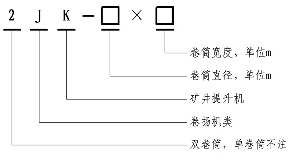 1:卷筒直径为2.5m、宽度为2.0m的单卷筒盘闸式单绳缠绕式矿井提升机型号为:JK2.5×2;